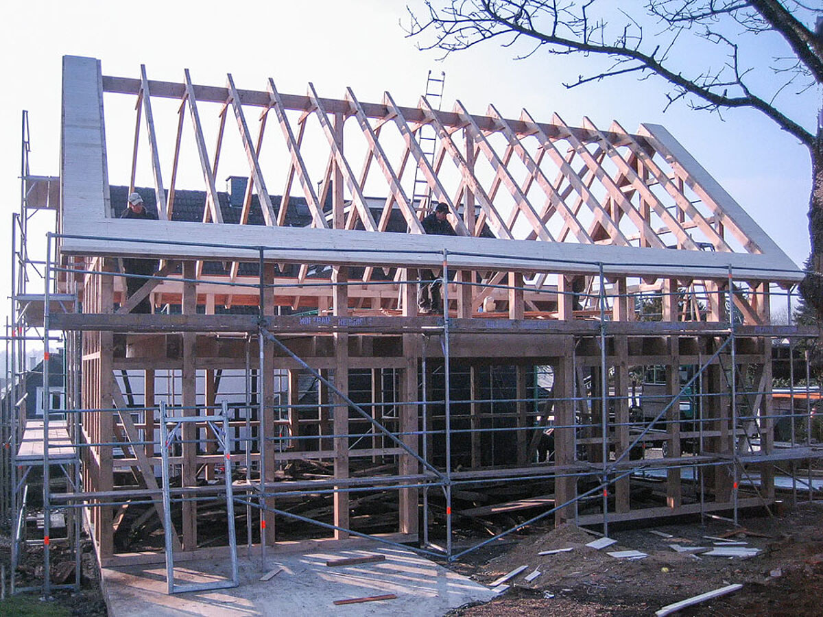 Beim Holzskelettbau besteht die tragende Konstruktion aus über mehrere Geschosse durchlaufende Stützen und Riegeln, die in bestimmten Achsen angeordnet sind. Das Holzskelett wird mit Holzwerkstoffen u.ä. ausgesteift. Auch hier wird eine ausgezeichnete Wärmedämmung durch Ausfüllen der Gefache erzielt. Diese Bauweise ist typisch für das "offene Wohnen" in Verbindung mit transparenten Fassaden.