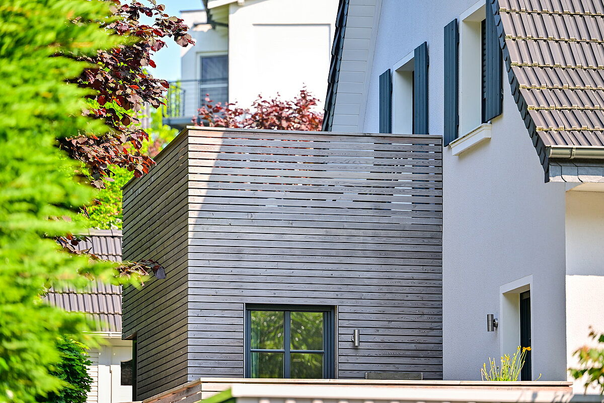 Der Anbau in Holzrahmenbauweise erweitert den Wohnraum im Erdgeschoss und öffnet den Wohnbereich zum Garten.